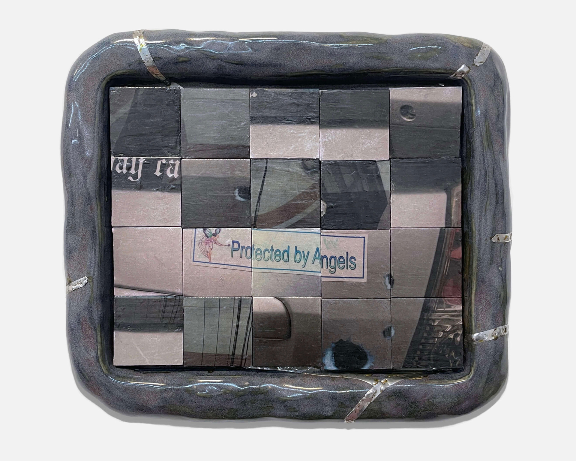 Gel photo transfer on ceramic tile, glazed stoneware, found pearls and gems